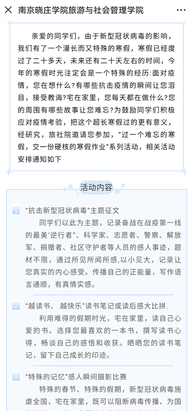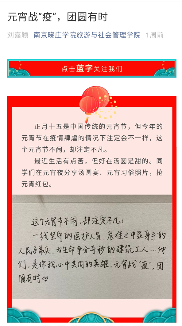 特殊的时期,特殊的形式,特殊的吹哨人,公司党政发布了yl6809永利告全院同学书,号召全体同学服从安排,做好个人防护,做到家庭也是课堂,做好停课不停学的学习安排。公司向全体员工布置了特殊的寒假作业;专业教师通过素生读书向全院员工推荐五十余篇阅读书籍;通过网络平台,建设全院师生大群,开展“天涯共此时,喜庆迎新年除夕夜特别策划活动、”迎新春,说民俗”活动,来自五湖四海的同学们分享了他们的年夜饭,用年菜讲述家乡故事,用图文生动描绘各地民俗;元宵佳节,公司以“元宵战‘疫’ ,团圆有时”为主题,用手写祝福语、短视频祝福等多种方式为逆行者和武汉加油祈福等网络教育活动。
