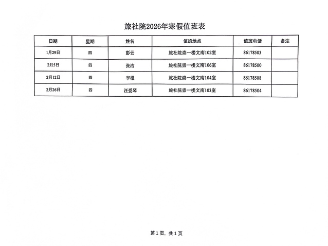2026年寒假值班表